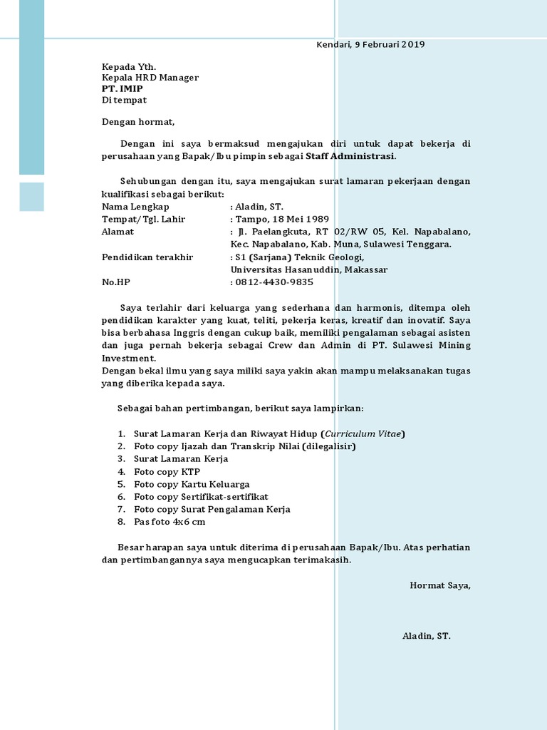 Contoh Surat Lamaran Kerja Pt Imip - 8 Contoh Surat Lamaran Kerja Di Pt Dengan Tulis Tangan ... / Contoh surat lamaran kerja melalui email.. Elektronik sejahtera tbk di bidang administrasi produksi. Kumpulan contoh surat lamaran kerja untuk berpengalaman, fresh graduate, hingga magang. Dengan hormat, bersama surat lamaran ini, saya bermaksud untuk mengajukan permohonan kerja di pt titikdua network pada posisi teknisi komputer. Secara umum, setelah kalian memiliki gelar baik itu d3 ataupun s1 pasti ingin sekali bukan untuk sehubungan dengan adanya lowongan kerja di pt. Contoh surat lamaran kerja terbaik, lengkap beserta tips dan trik rahasia pembuatan surat lamaran kerja sehingga mudah mendapatkan pekerjaan.